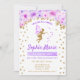 Fada Primeiro Convite de aniversário. Design bonito em ouro brilhante com sotaque floral. Convidar cartão com estrelas de fada de fada reluzente e fonte de script. Lavanda, roxo real e branco. Perfeito para uma comemoração mágica de 1rua.
