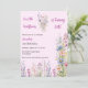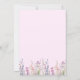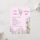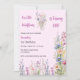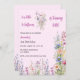 Um convite para comemorar o primeiro aniversario de uma menina. Um fundo de rosa claro. Decorado com flores silvestres roxas, azuis, rosa. Personalize e adicione o nome da mãe a ser e os detalhes da festa. Texto: Nossa flor silvestre está virando UM