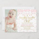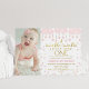 Primeiro aniversario de Fotografia Pink Cloud Twinkle Twinkle Star Invitation A pequena estrela de brilho brilhante da menina foi o primeiro convite de aniversário com três nuvens rosa, estrelas rosa, e caligrafia e lua em ouro. O primeiro convite de aniversário desta menina temática estrela também apresenta uma foto na frente e é ideal para o primeiro aniversário de uma garota.