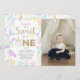 Tenha uma aventura cheia de rosquinha para o seu primeiro aniversário com este Encantado Convite para primeiro aniversario de Foto de Rosquinha do Sweet One Unicorn. Mostre seu adorável sorriso com sua foto favorita, cercada por rosquinhas de unicórnio com cores aquáticas lúdicas. Personalize-o com os detalhes do seu precioso e faça esta celebração tão doce como a sua pequena.