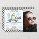 Blue Racing Carro Balão Girafa Foto primeiro aniversario Convite para fotografia Um belo carro de corridas de fotos de garotinho temeu o primeiro convite de aniversário com carro de corrida azul, girafa fofa, balões azuis e bandeiras. Este convite de aniversário rápido para um carro de corrida também apresenta um padrão verificado preto-e-branco e um texto de caligrafia moderno. Excelente para o carro de corridas vermelhas de um garotinho no primeiro aniversário.