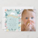 Este lindo coelho está fazendo 1rua/primeiro convite fotográfico de aniversário de um menino apresenta um fundo azul claro com coelho branco saltando cercado por flores e verdes. O verso apresenta um fundo branco com padrões de verificação pintados à mão em azul claro. Personalize-o para as suas necessidades. Você pode encontrar produtos correspondentes na minha loja.