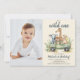 Celebre o seu primeiro aniversário com este charmoso convite com o tema safari, com um carro de aquarela, cheio de um adorável leão, elefante, macaco e girafa. As cores pastéis suaves e o verde-luxuoso criam uma atmosfera quente e caprichosa perfeita para uma aventura alegre. O estilo de aquarela pintado à mão adiciona um toque doce e artístico que famílias e amigos irão adorar. Ponha o tom para uma celebração maravilhosa e selvagem com esta lindamente feita!