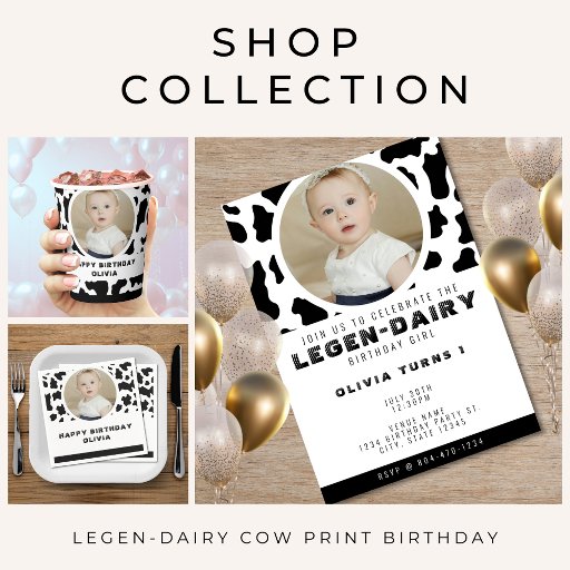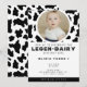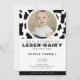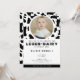 Convite de festas primeiro aniversario de impressão de vaca branca e negra. Design de Unisex para rapazes e raparigas. Personalize-o com os detalhes do seu evento e uma foto do convidado de honra de aniversário.
