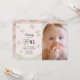 O convite para fotos de primeiro aniversario desta garota fofa apresenta um fundo de rosa claro com margaridas brancas caindo. O verso apresenta um fundo cor-de-rosa com padrões de margarida brancos. Personalize para suas necessidades. Você pode encontrar mais produtos correspondentes na minha loja.