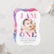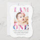 As modernas espirais cor-de-rosa, roxo e azuis com a inscrição "I AM ONE" destacam a foto do convite para o primeiro aniversario do seu bebê. Disponível em outras combinações de cores, você pode facilmente adicionar detalhes de sua parte a este primeiro modelo de convite de aniversário.