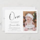 Veja este simples e elegante convite de aniversário de fotos para a sua festa de primeiro aniversario. Esta design inclui a imagem do bebê junto com o texto. Personalize este adorável cartão de convite com seu texto, fotos do bebê e detalhes da festa usando a opção personalizar.