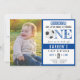 Celebre o primeiro aniversario do seu novato com o Convite para primeiro aniversario de Foto do Caco de Cores de Água. Este adorável convite apresenta um tema de futebol, design de aquarela e matizes azuis. A ilustração fofa da bola de futebol captura o espírito alegre da celebração. O título "Little Rookie" enfatiza o espírito principiante do primeiro ano do seu filho. O número proeminente ""Um"" acrescenta um toque comemorativo. Perfeito para famílias que amam o esporte, este convite combina estética e elementos de temas desportivos, e com um espaço para vocês, fotos pequenas, cria um design atraente e atraente visualmente. Capturar a cudez e o entusiasmo do primeiro aniversário do seu filho com este charmoso convite inspirado no futebol.