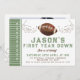 Green Brown Photo Game Play Convite para o primeiro aniversario de futebol Fúcil convite temático para o primeiro aniversário de um bebê com alguns lados e linhas finais, um futebol marrom e alguns desenhos de jogo. Todo texto é editável e há uma foto no verso.