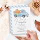 Esta bela vintage, e rustica chamada de "abóbora" de 1rua/primeiro aniversário do menino apresenta um caminhão azul cheio de abóboras e flores. O verso apresenta um fundo branco com padrões de verificação de gingham azul. Personalize para suas necessidades. Você pode encontrar mais produtos correspondentes na minha loja.