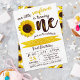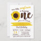 Estes bonitos convites de girassol são perfeitos para qualquer um que comemora um primeiro aniversário neste primavera ou verão. O design apresenta um girassol brilhante sobre um fundo branco simples, com uma redação fácil de personalizar modelo.