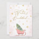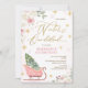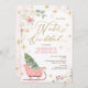 Primeiro aniversario de inverno Onederland de inverno, cor-de-rosa, Fita-rosa, propina. Convite para o primeiro aniversário do inverno, inverno, estreito, para uma menina com dois arranjos florais cor-de-rosa e branca, um trenó rosa, um talo de ouro decorativo, fetos de neve e árvore de Natal. Neste inverno, um primeiro convite de aniversário é ideal para o primeiro aniversário de dezembro para uma menina.