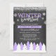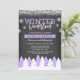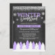 Este convite de aniversário moderno de inverno, apresenta um design de floresta de neve em um fundo de quadro. As cores púrpura e branca lilás realmente pop no fundo das cinzas escuras. Tão fofo para uma festa de primeiro aniversario de inverno.