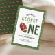 O convite para o primeiro aniversario deste miúdo moderno apresenta um design desportivo verde, com um fazer de futebol bonitinho, o 'ONE', e um padrão de correspondência no verso. O convite pode ser personalizado com o nome do seu filho e outros detalhes necessários para a sua festa. A perfeita adição do tema desportivo à primeira festa de aniversário do tema futebol americano do seu filho.