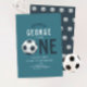 O convite para o primeiro aniversario deste miúdo moderno apresenta um design desportivo azul, com um fazer de bola de futebol giro (futebol) "ONE", e um padrão de correspondência nas costas. O convite pode ser personalizado com o nome do seu filho e outros detalhes necessários para a sua festa. A perfeita adição do tema desportivo à primeira festa de aniversário do seu filho.