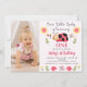 Foto Red Black Little Ladybug primeiro aniversario Convite Cute nosso pequeno convite de aniversário de ladybug apresentando uma joaninha fofa e várias flores e folhagem em um fundo cor-de-rosa claro. Este convite de aniversário da joia pode ser usado para qualquer idade e apresenta uma foto na frente.
