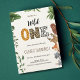 O convite ao primeiro aniversario apresenta caligrafia com letras bonitas em forma de animal e um fundo maravilhosamente arranjado adormecido com folhas tropicais e animais encantadores. É um jogo perfeito para a decoração de um aniversário selvagem do seu bebê. Você também pode editá-lo sem esforço usando o botão personalizado ou a ferramenta "editar usando o design." também pode alterar o tipo de papel conforme o orçamento.
