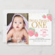 Morango Doce, o primeiro convite de aniversário do bebê com foto em rosa, verde e ouro com morango doce e sotaque de ouro impresso.