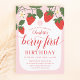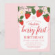 Um modelo de primeiro aniversario de morango bonito. Faz uma escolha perfeita para um primavera ou aniversário de verão. Este primeiro design de aniversário de morango de moenda funciona bem para uma festa de primeiro aniversario de morango. O design apresenta morangos vermelhos, vinhas verdes e flores brancas em fundo de rosa claro com uma letra moderna de escrita de caligrafia.
