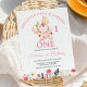 Flores Selvagens Multicoloridas Pequeno primeiro aniversario de Porquinho Convite para o aniversário de uma menina com uma face de porco aquarela e flores silvestres multicoloridas. Pode ser utilizado em qualquer idade.