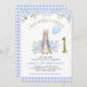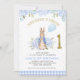O belo coelho temeu o primeiro convite de aniversário para um bebê com uma ilustração fofinha de Peter Rabbit, vários arranjos florais azuis do bebê, pontos falhos de brilho dourado e número. O título e o número do ouro falso são removíveis. Esta design é ideal para alguém que tenha uma festa de aniversário temática Peter Rabbit.