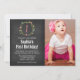 Um quadro de flores primeiro convite de aniversário. Apresentando uma ilustração de cor azul esbranquiçada em tons ou rosa, verde e lacrimogêneo. Personalize facilmente a foto e a informação do seu filho.