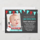 Um design de inverno bonito para uma festa de primeiro aniversario no inverno para um menino. Design apresenta um boneco de neve balbucioso, faixa de bunting pendente, flocos de neve e fundo de chalkboard em cores modernas de azul vermelho e azul-marinho.