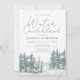 Este moderno inverno, modelo de primeiro aniversario de convite para o do garoto ONEderland, apresenta árvores de cor d'água azul e árvores de florestas verdes, neve e uma fonte de script de tendência.