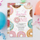 Torne o seu primeiro aniversário extra especial com este belo convite personalizado de rosquinha! Apresentando rosquinhas coloridas de fosco, aspersores e tipografia pastel rosa e marrom divertida, este convite é totalmente personalizável com o nome do seu filho, data da festa e detalhes. Perfeito para uma festa de aniversário temática de rosquinha! Texto editável para ajustado dos detalhes do evento. Disponível como convites impressos ou downloads digitais