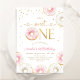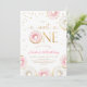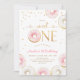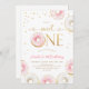 Dourada rosquinha de ouro branco rosa doce um convite de festas primeiro aniversario. Design de tendências cegas com rosquinhas cor-de-água rosa e branca. Apresenta a fonte de tipografia um e a escrita hart. Você pode escolher convites impressos e/ou fazer o download instantâneo do modelo digital. Perfeito para uma festa de 1ª mulher na moda.