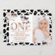 Rosa Dourado Uma Foto primeiro aniversario Floral de Vaca Convite Raparigas vacas recebeu o primeiro convite de aniversário com uma falsa palavra de ouro rosa adornada com flores, dois maiores arranjos florais cor-de-rosa e um livro-padrão de impressão preto. O primeiro convite de aniversário para a vaca desta menina é ideal para a primeira festa de aniversário do tema da vaca.