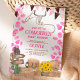 Rústico nosso primeiro convite de festas rodeio de primeiro aniversario de vaca ocidental apresentando um tema do deserto rústico, com crânio de vaca boho, lasso de cowboy, bandeiras de bunter castanho e rosa, chapéu de cowboy, roda de madeira rústica, pilha de feno, buquê de girassol, signo de madeira com salão e cavalos ( o texto pode ser editado) e vaca rosa selvagem padrão. Vire-se e junte-se a nós para um primeiro aniversário!