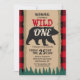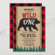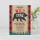 Convide seus hóspedes em estilo com este convite de festas de primeiro aniversario de temas do Wild One. Esta design apresenta um fundo de xadrez de búfalos vermelha e preta com sotaques de burvolta bronzeada. Um urso com as palavras Wild e One na tipografia moderna decora o cartão. Todos os seus detalhes para a celebração podem ser personalizados. Abaixo está uma fileira de pinheiros verdes para adicionar à sensação de floresta do design. Desenhado pela artista ©Susan Coffey.
