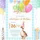 Adorável e doce convite de primeiro aniversario para garotas de ganso de um bobo com um ganso de bebê de cor d'água com um chapéu de festa e balões sobre um fundo de xadrez rosa e pastel macio.