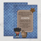 O primeiro convite de aniversário do bebê do templo ocidental feito em azul no fundo azul de verificação do gingham em apuros. Uma área marrom de papelão como uma área de texto tem gráficos de uma estrela, uma criança cowboy e um cavalo. Personalize todo o texto para o dia especial do seu homenzinho.