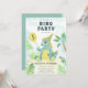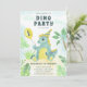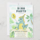 Primeiro convite de aniversário com o título "Partido Dino" junto com um dinossauro pintado a aquarelas segurando um balão com o número um (a idade no balão pode ser alterada para a idade do seu filho). Este primeiro aniversario bonito é excelente para um garotinho.