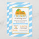 Bonitos primeiros aniversarios de abóbora. Apresentando riscas azuis e brancas diagonais, bordas folhetantes douradas e abóboras cor de água laranja. Um convite para uma festa de aniversário do tema do outono.