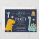 Um belo convite para primeiros aniversarios de dino-partidário para meninos ou meninas, apresentando uma colorida cena mundial pré-histórica. Um tipo fino e elegante, de cor, em laranjas, azuis e brancos. O reverso dos convites apresenta um fundo escuro com um grande dinossauro ambulante. Adicione o nome do seu filho e os detalhes da festa. Vibrante estilo infantil moderno.