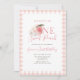 Bem-vindos aos seus amigos e família ao primeiro aniversário do seu filho com este belo convite para o tema dos pêssegos! Este belo convite apresenta um design de pêssego aquoso, junto com um padrão clássico de gingham em uma delicada matiz de pêssego. A combinação dos dois cria um convite espantoso que certamente dará uma impressão duradoura. Perfeito para uma primeira festa de aniversário, este convite é para que a sua celebração se lembre!