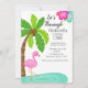 Vamos Flamingle com este convite de primeiro aniversário. Há um flamingo na água debaixo de uma palmeira grande e bela. Personalize com as informações de seu partido.