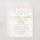 Foto em nuvem rosa Twinkle Twinkle Star primeiro aniversario Convite à apresentação de uma pequena estrela giratória e cintilante de menina Enxertada O primeiro convite de aniversário com três nuvens cor-de-rosa, estrelas rosa, e a falsa caligrafia e lua em ouro. O primeiro convite de aniversário desta menina temática estelar também mostra uma foto no verso e é ideal para o primeiro aniversário de uma garota.