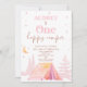 Meninas rosa Feliz primeiro aniversario de Camper Convite Meninas acampam o primeiro convite de aniversário com uma tenda de aquarela, silhuetas rosa rosa rosa, lua, estrelas e um título de caligrafia moderna. Este feliz convite de aniversário para o primeiro aniversário do camper é ideal para o primeiro aniversário do acampamento para uma menina.