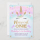 Arco-Íris Unicórnio Dourado Glitter Convite para primeiro aniversario de Glitter Linda Menina Colorido unicórnio com o primeiro convite de aniversário com um rosto unicórnio, alguns corações, cores do arco-íris e o título falso de brilho dourado. Esta é uma maneira fofa de convidar convidados para uma primeira festa de aniversário do arco-íris.