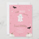 Você está procurando um convite de aniversário no Dia das Bruxas que está certo? Não olhe mais. Este encantador convite mostra um fantasma giro com estrelas aquáticas brancas e abóboras contra um pano de fundo cor-de-rosa pastel. Use as ferramentas de design para personalizar o texto e a idade.