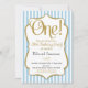 Um convite ao primeiro aniversario para garotos azuis elegantes, com listras azuis e brancas pastéis com um falso quadro de acentos dourados, texto preto e dourado fofo e um rico enorme "Um!" no topo. Um bonito convite de aniversário azul para aquele doce menino de quase um ano.