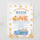 Blue Orange Pumpkin Truck primeiro aniversario Convite à queda de um caminhão de abóbora azul ou Convite de primeiro aniversário de outono para um garotinho que também apresenta algumas abóboras laranja e branca e algumas folhas de outono. Este nosso pequeno abóbora fazendo um convite de aniversário de outono é uma maneira fofa de convidar convidados para uma primeira festa de aniversário de abóbora.