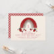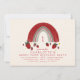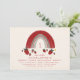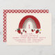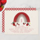 Tema do primeiro aniversário de Berry com ilustração do arco-íris rosa e vermelho com morangos, flores e folhas. O reverso é gingham vermelho. O texto é vermelho.
