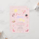 Esta primeira viagem ao redor do convite de aniversário do sol apresenta textos retrorados dos anos 70, cores rosa e roxo e ilustrações espaciais. As ilustrações são planetas, estrelas e foguetes. As costas são cor-de-rosa com estrelas douradas, fazer este o convite perfeito para celebrar o seu pequeno sol.