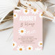 Cor-de-rosa Laranja Retro Girls Daisy primeiro aniversario Invitation Cute hippy style daisy primeiro convite de aniversário para uma garotinha que apresenta a palavra um feita de uma margarida grande e texto de roteiro. O primeiro convite de aniversário desta rapariga também apresenta algumas margaridas brancas e laranja num fundo cor-de-rosa.