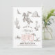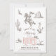 Este retrô e chico "primeiro rodeio", cowgirl, com o tema 1rua/primeiro convite de aniversário, apresenta uma vaqueira em um cavalo, águia, cacto, chapéu de cowboy/cowboy e crânio. O verso apresenta um fundo de rosa claro com padrões de cacto. Personalize para suas necessidades. Você pode encontrar produtos correspondentes na minha loja.